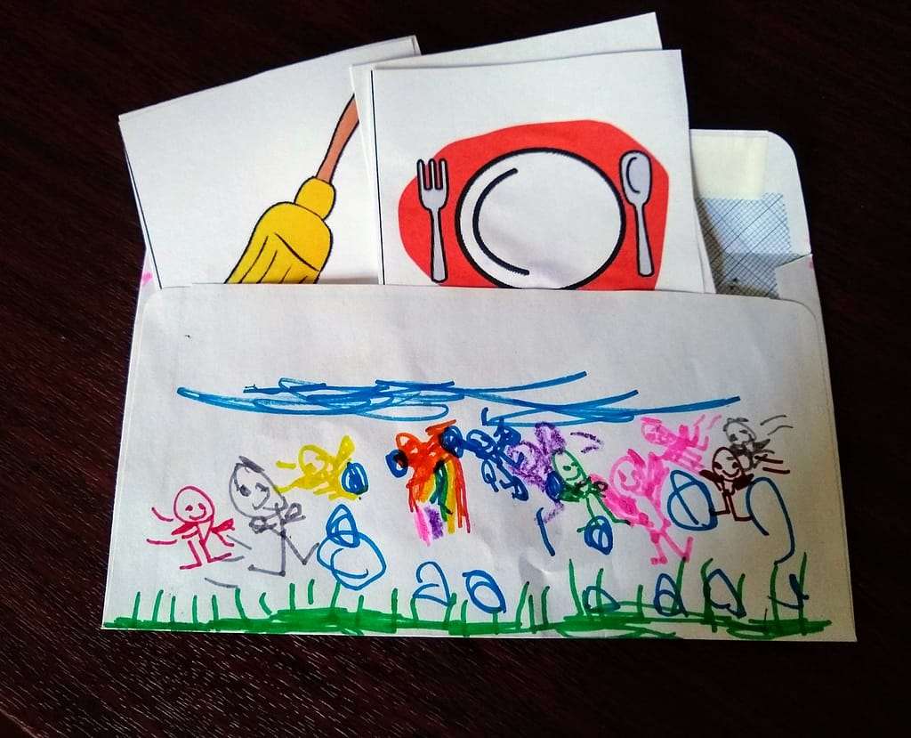 Then, each morning (so I don’t forget) I put a pre and 1 post dinner job card in each envelope. When it’s dinner time we all get our envelopes and complete our assigned jobs. (Bringing dinner to the table always goes to an adult. Clearing the table always goes to my husband, because I can’t even).